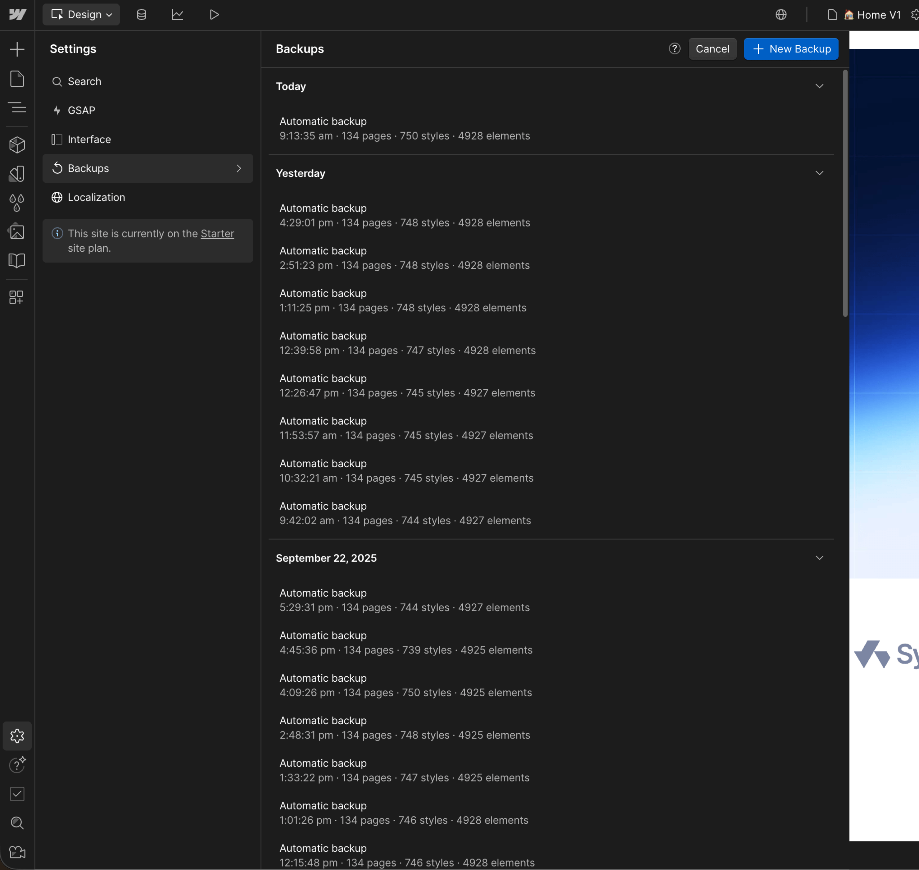 If something goes wrong, for example, if you are not liking where the website is going to, if you deleted some critical classes that were required to make the Template look nice, or if you just want to go to a previous version for any reason, you can always go to the Backups section.